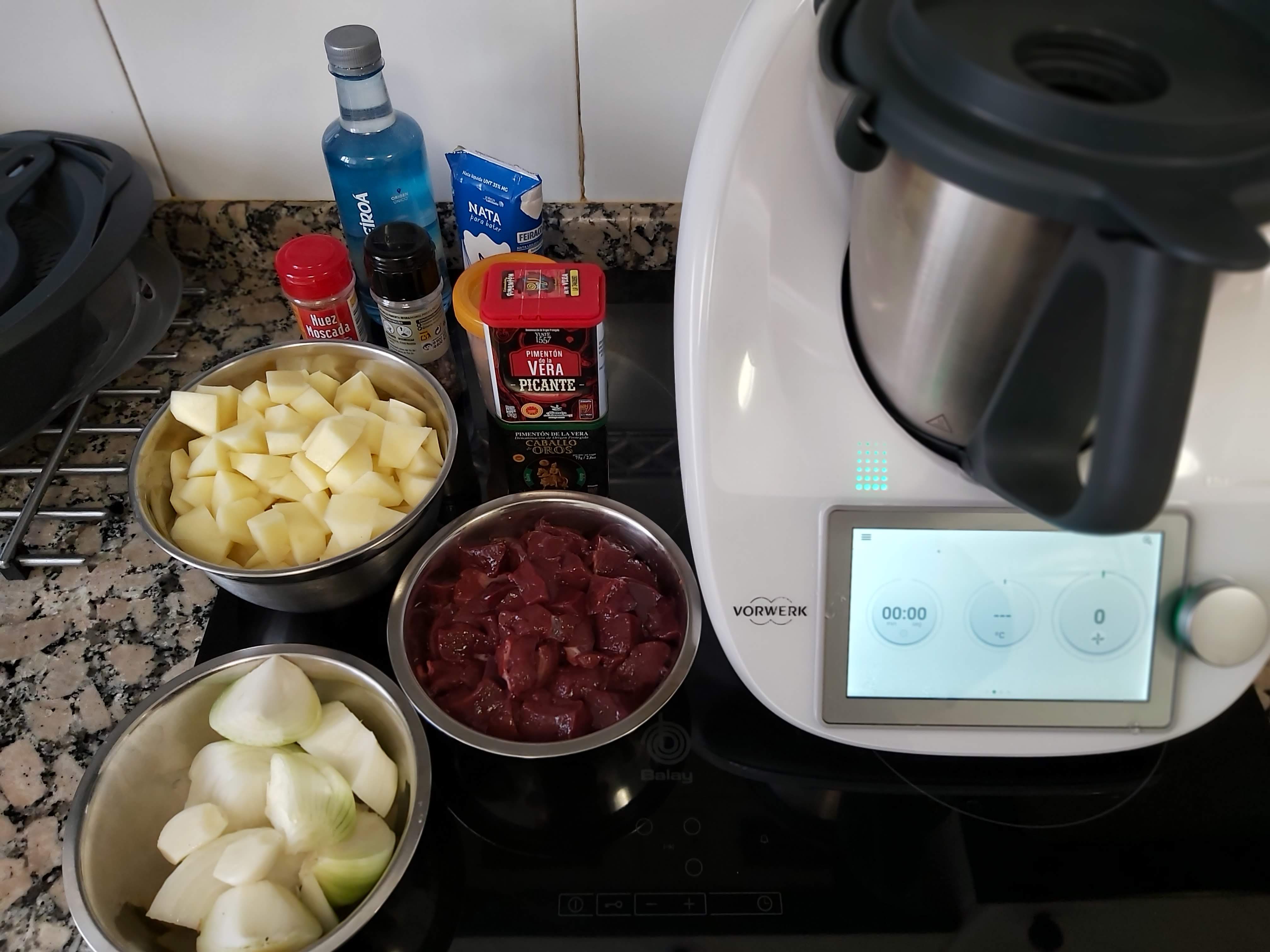 - Agrega ahora el pimentón dulce y picante, el laurel y el vino y programa 2 min/ 100ºC/ giro inverso/ vel cuchara