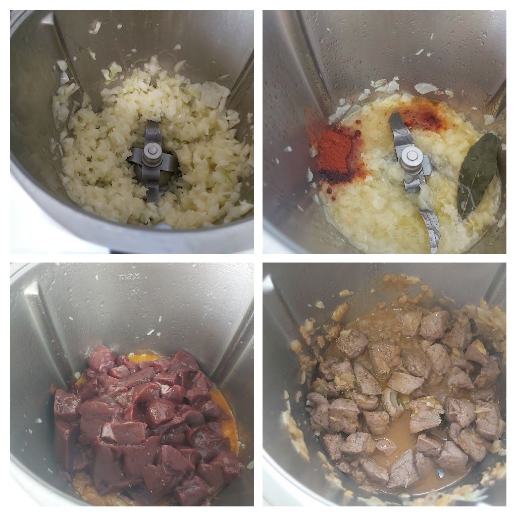 - Echa el hígado y la sal y programa 7 min/ 120ºC/ giro inverso/ vel cuchara. Reserva en un bol tapado con un film ó con papel de aluminio para que no pierda la temperatura.