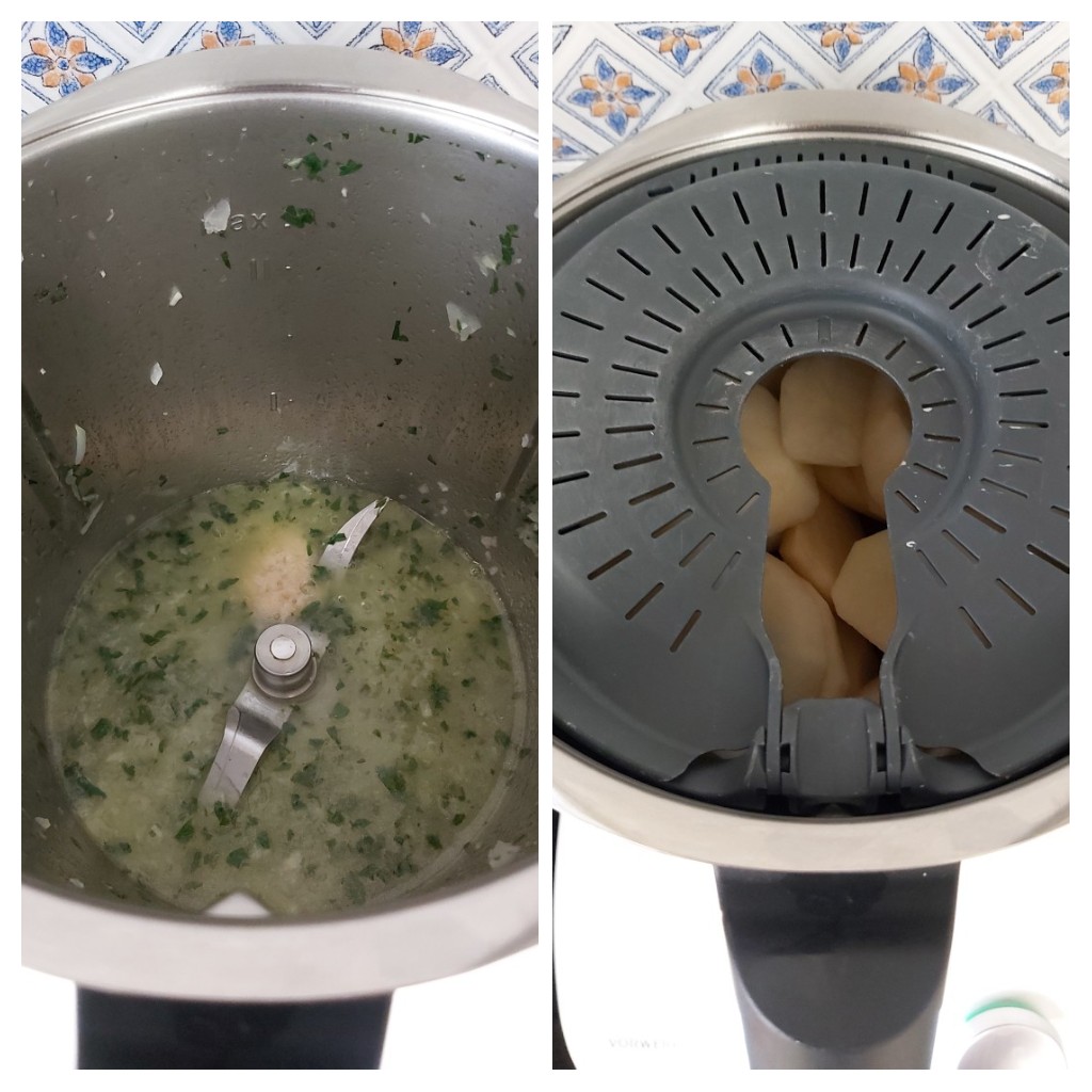 Ahora troceamos los ingredientes del sofrito de la salsa verde ( cebolla, ajo, y aceite ) 5 seg/ vel 5, coloca ahora el vaso en el Friend y programa 8 min/ 120°C/ vel 1.
