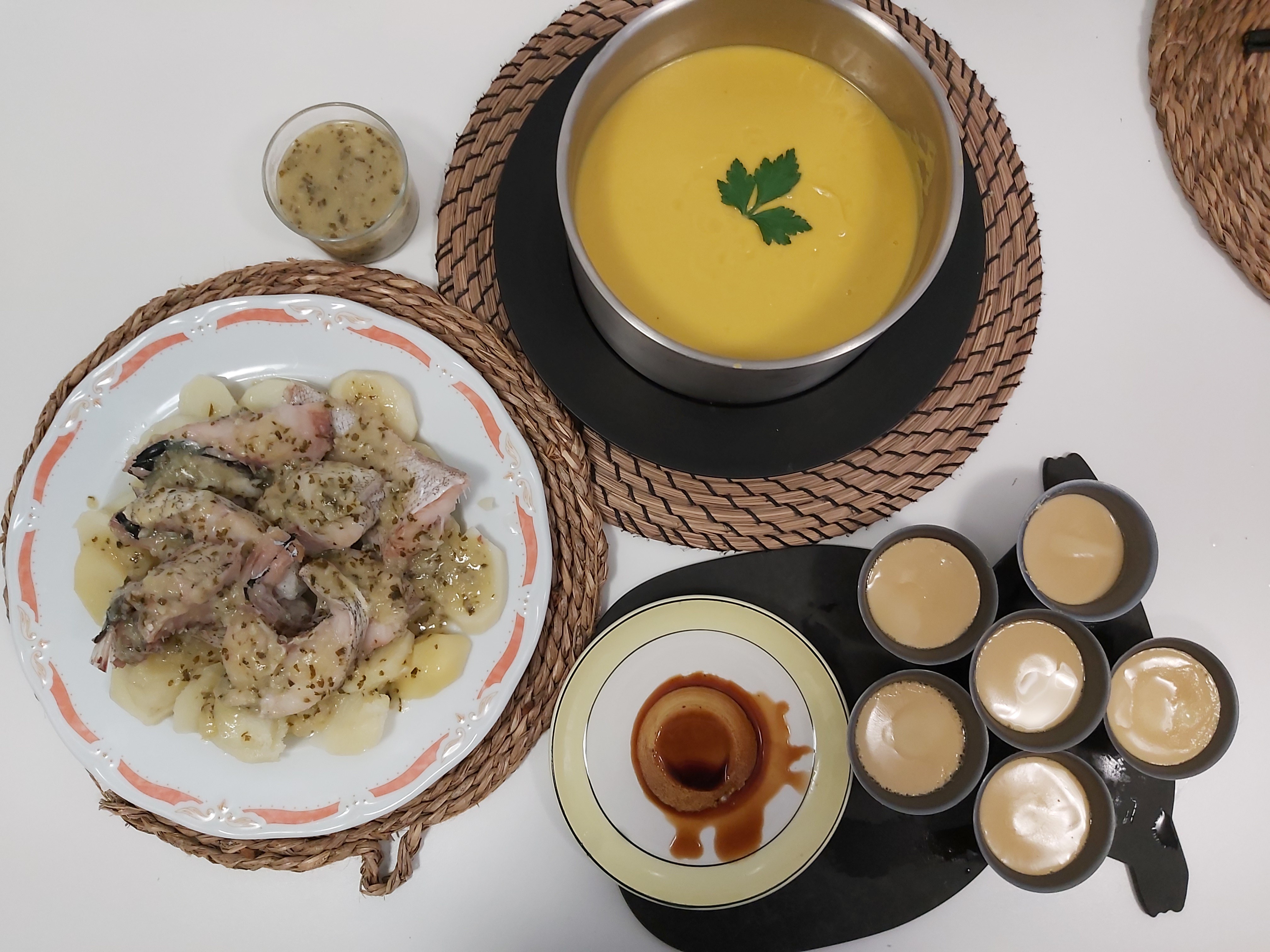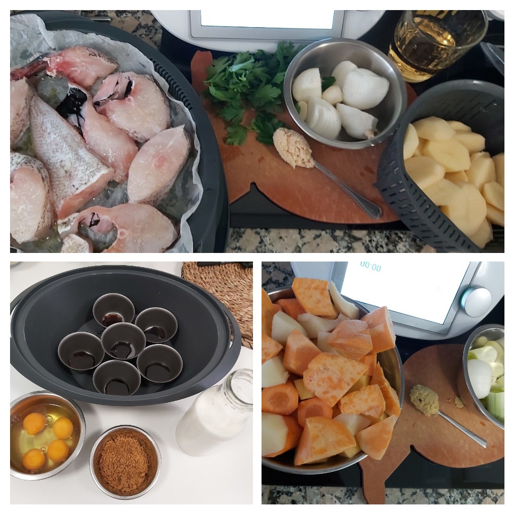 MENÚ COMPLETO con Thermomix y Friend. Crema de verduras, pescado en salsa verde con patatas y flanes