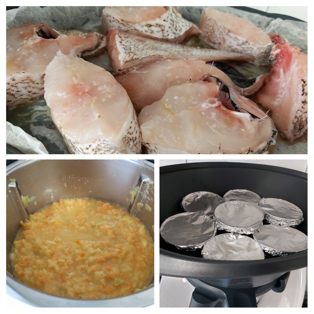 Terminará el sofrito de la crema en nuestro Thermomix, añade las verduras de temporada y trocea 20 seg/ vel 5 ( puedes introducir la espátula por el vocal para ayudarte a trocear) añade el agua y el concentrado casero. Coloca el recipiente Varoma en su posición con las flaneras, pon encima la bandeja Varoma con el papel de horno humedecido y encima el pescado salpimentado y regado con el aceite. Tapa el Varoma y programa 30 minutos/ Varoma/ vel 1.
