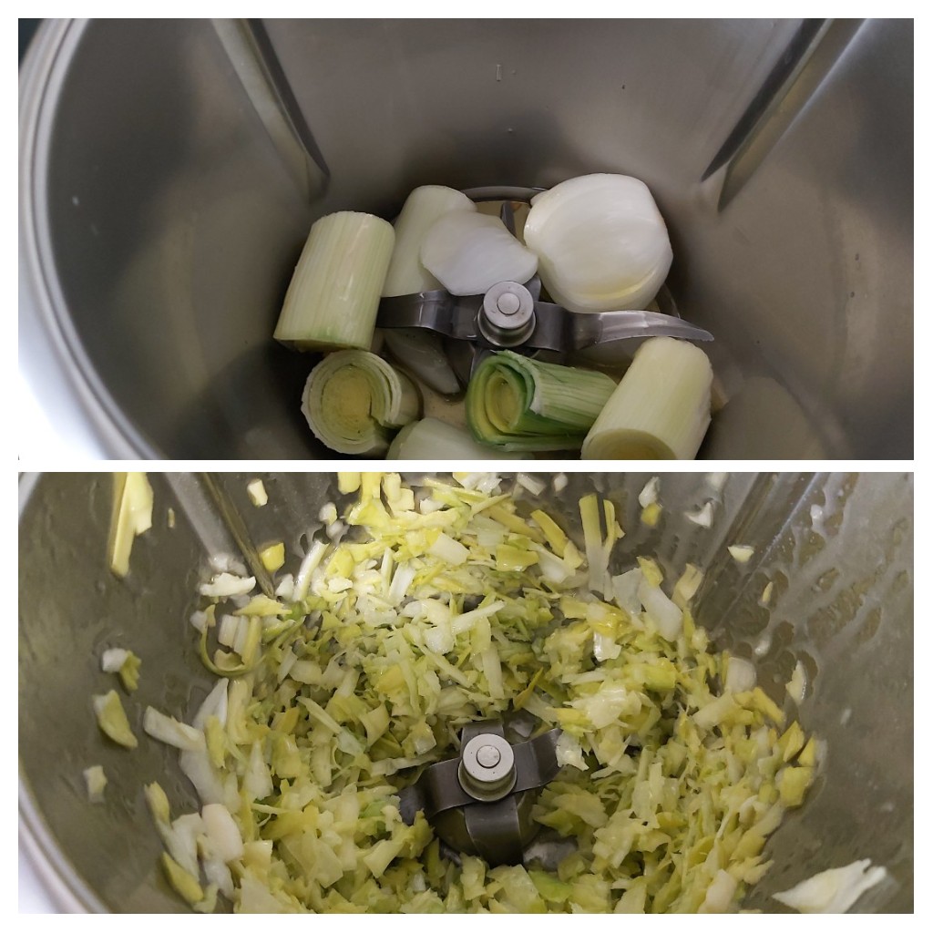 Coloca en el Thermomix el primer vaso, que tendremos aclarado, y trocea los ingredientes del sofrito de la crema ( puerro, cebolla, ajo y aceite ) y programa 10 min/ 120°C/ vel 1.