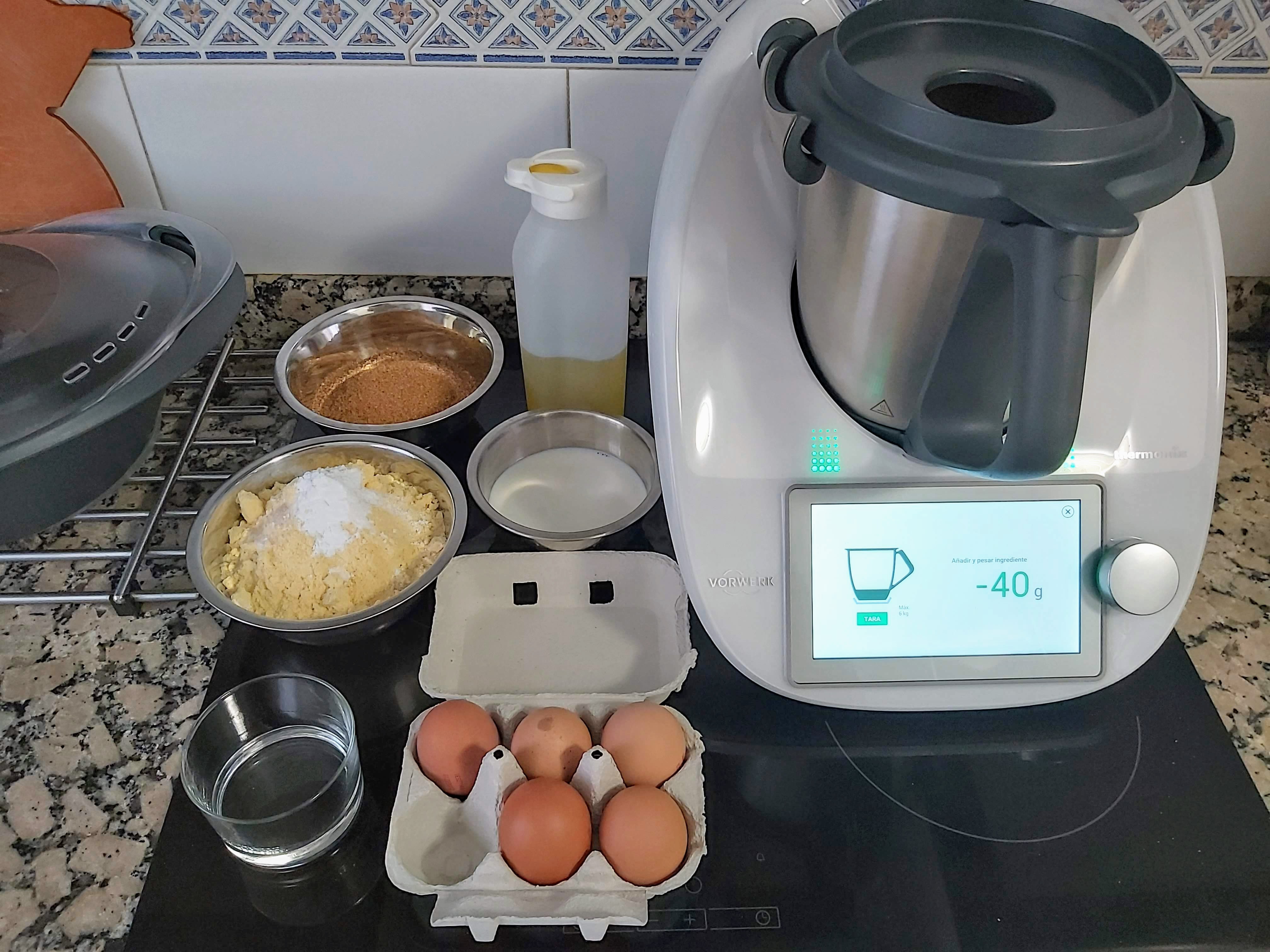 Coloca la mariposa en el vaso, echa los huevos y 200 g de azúcar y bate 5 min/ 37ºC/ vel 3,5