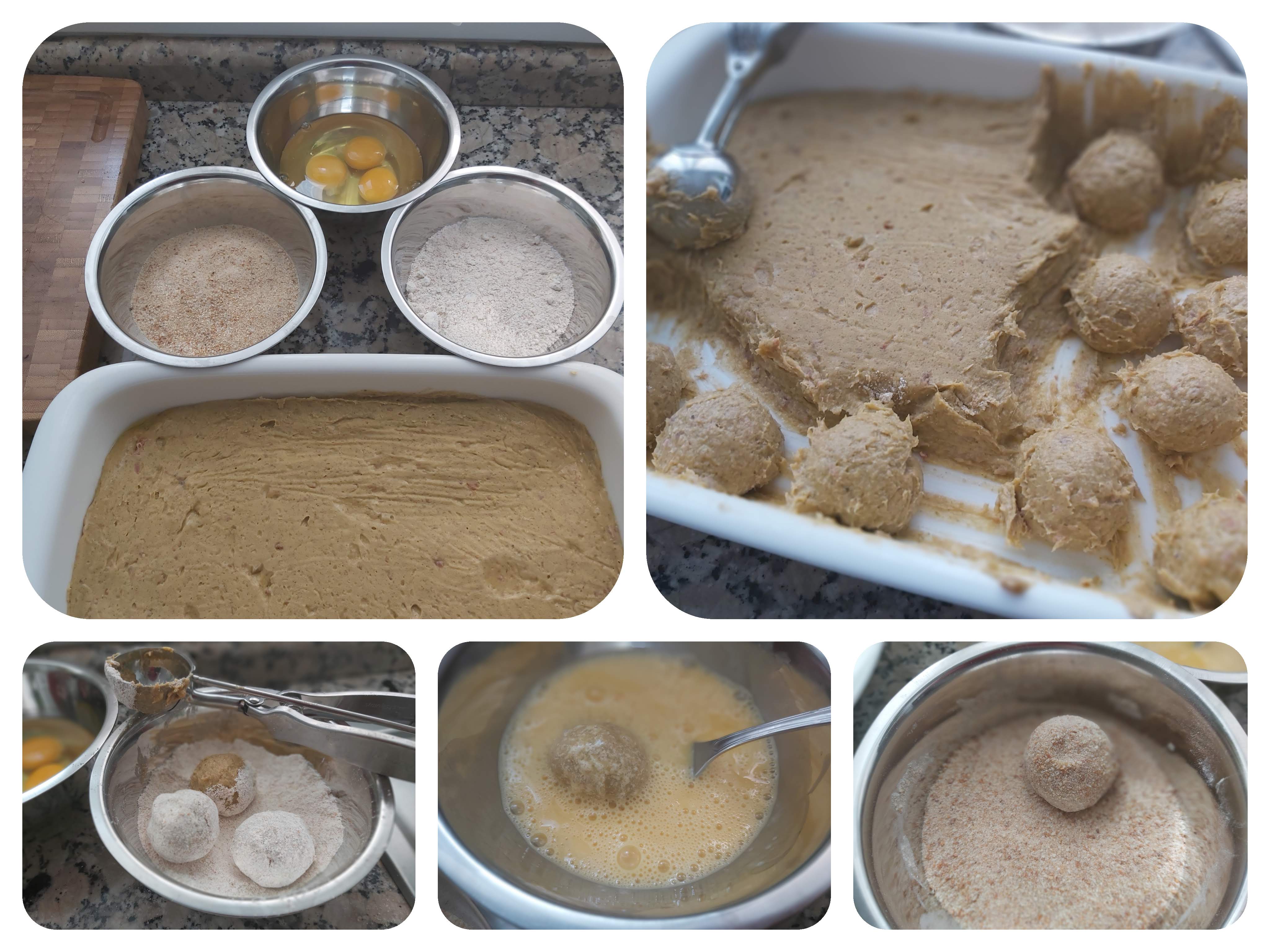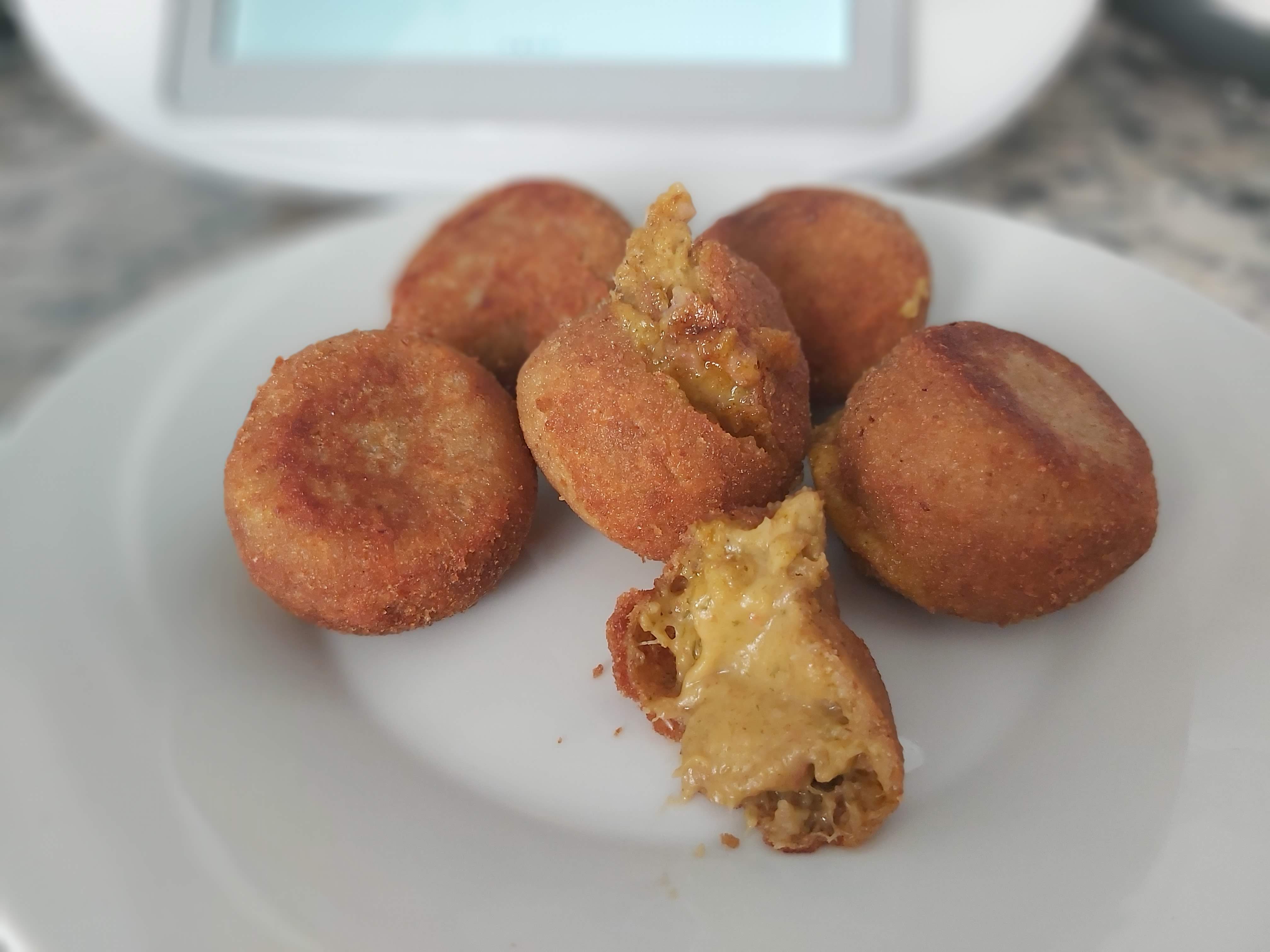 Hago bolas con la masa con ayuda de un porcionador de helados, después rebozo en harina, huevo y pan rallado. Como ves voy una a una haciendo girar la bola moviendo el cuenco y se rebozan solas, sin tener que tocarlas. Una vez listas frío en abundante aceite, sólo unas pocas .....ja!ja!ja!, escurre en un papel de cocina y sirve calientes.
