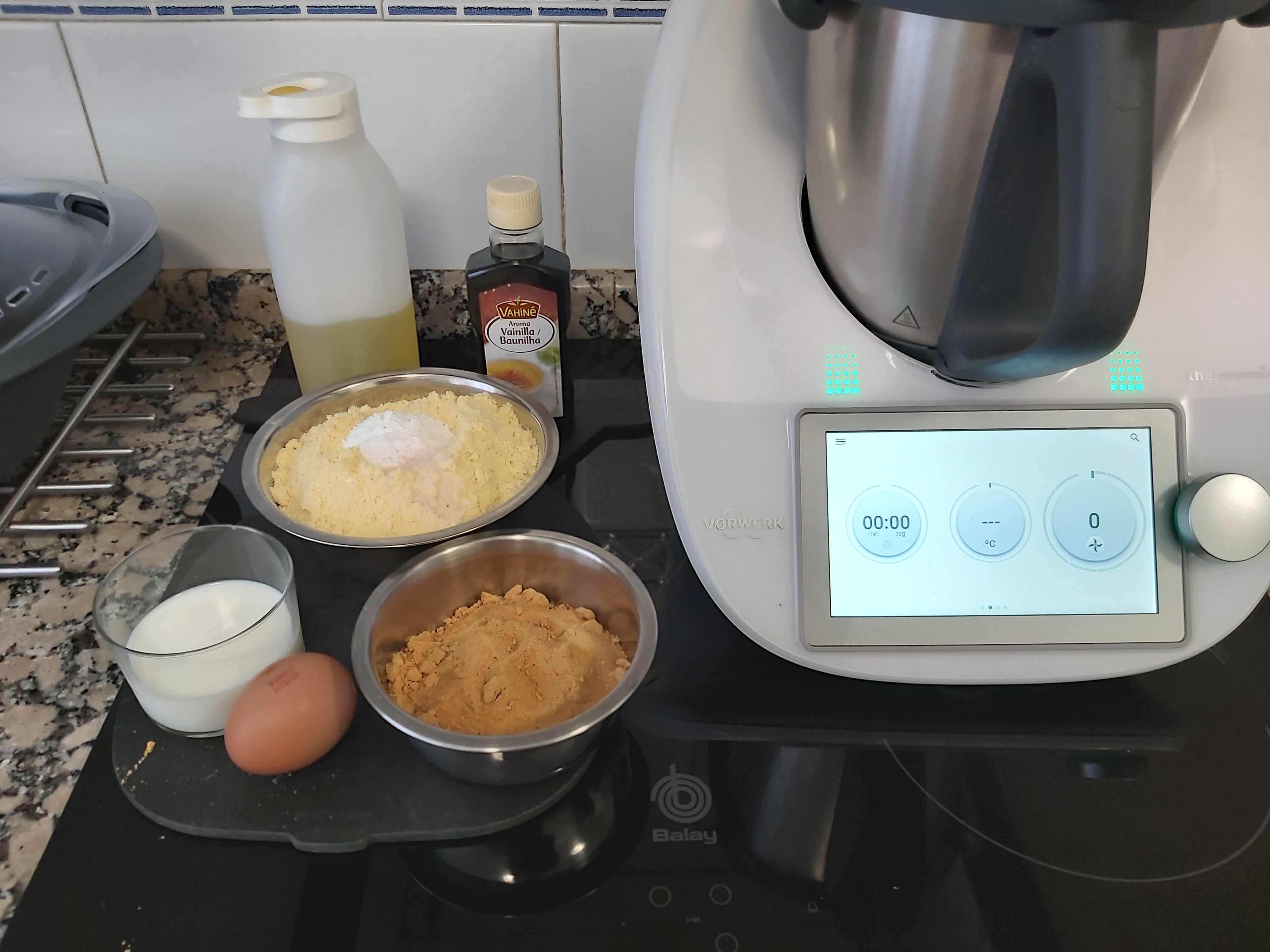 Vierte el azúcar, el huevo, la vainilla y el aceite, mezcla 30 seg/ vel 4.