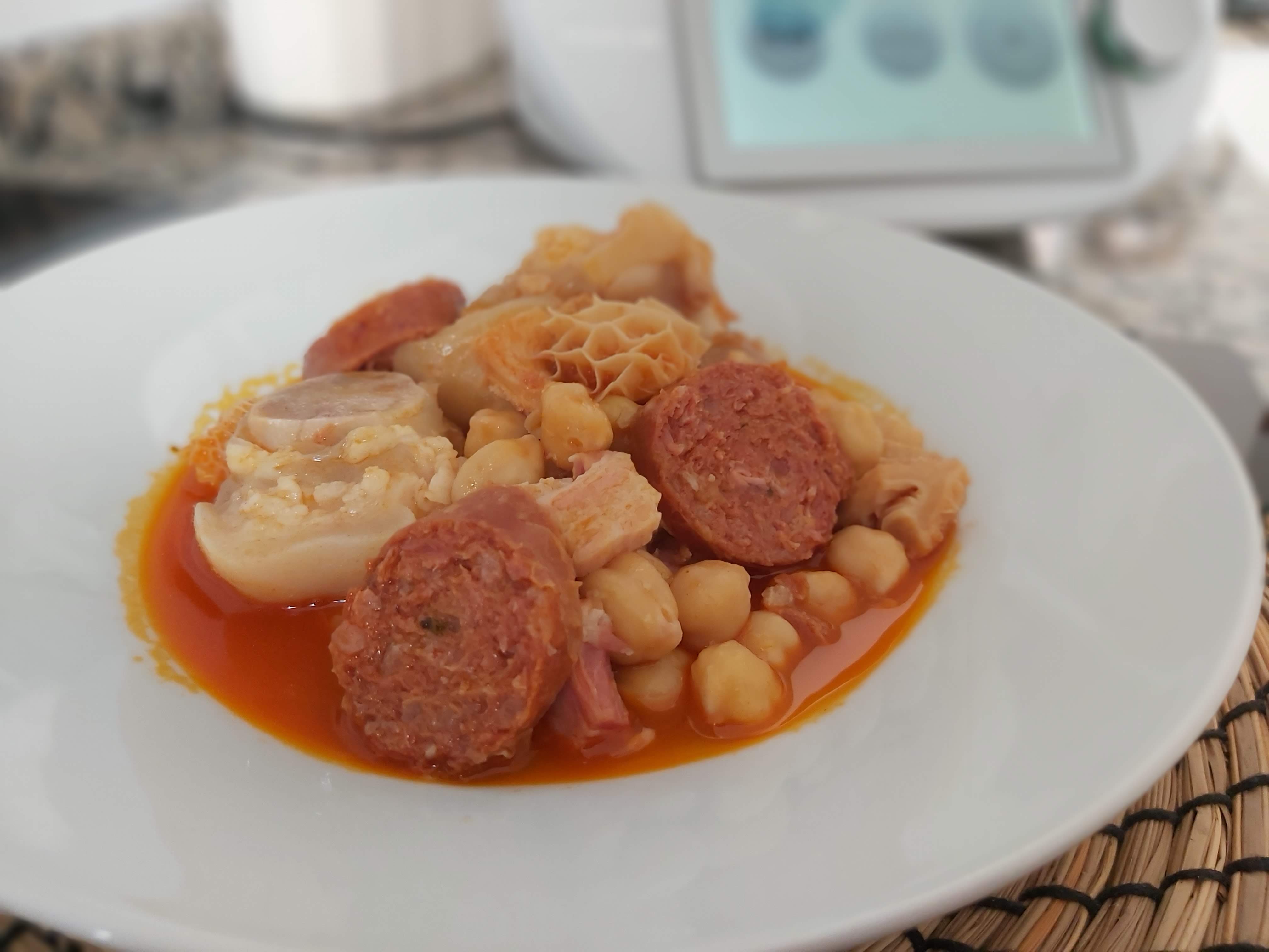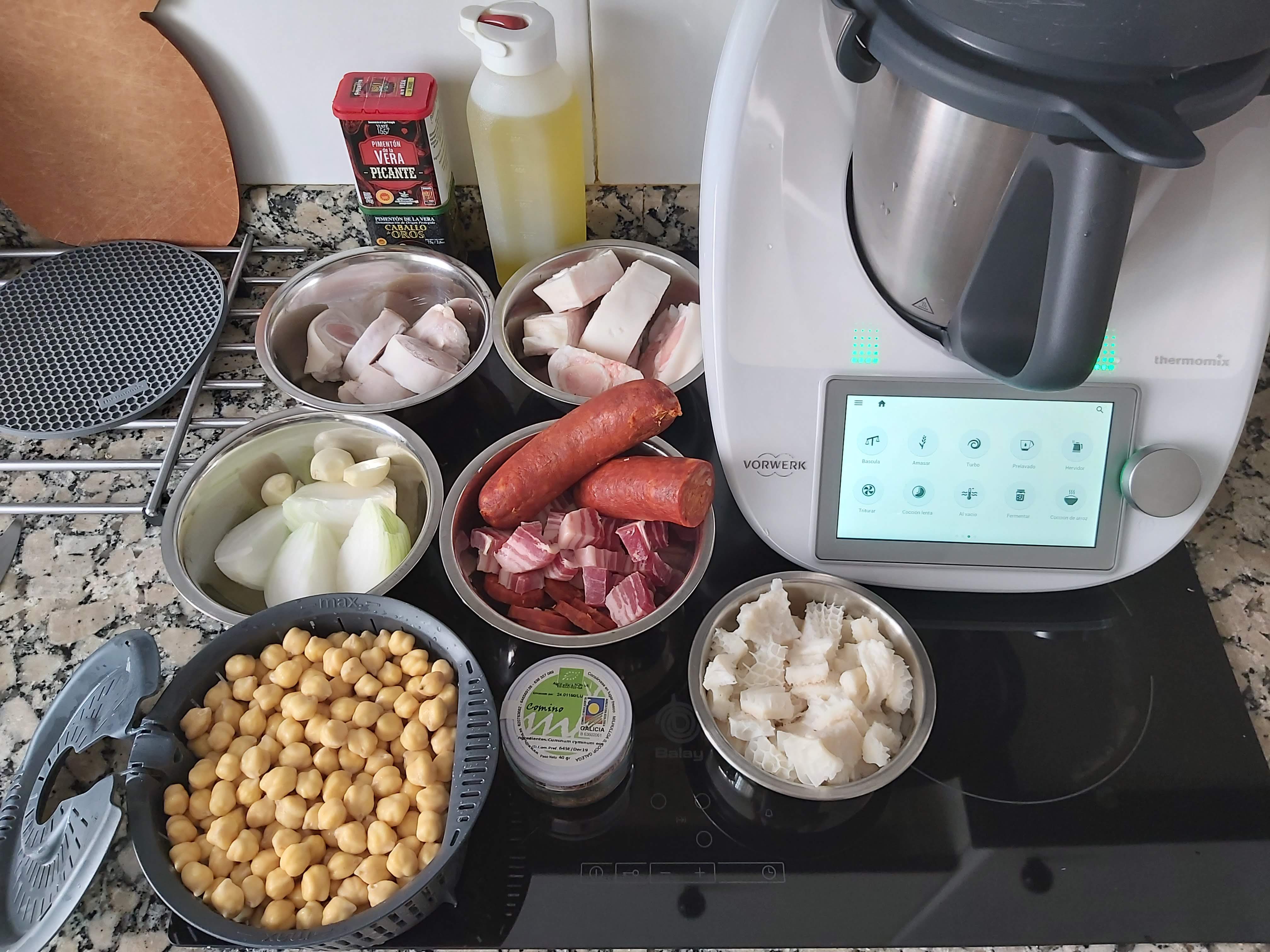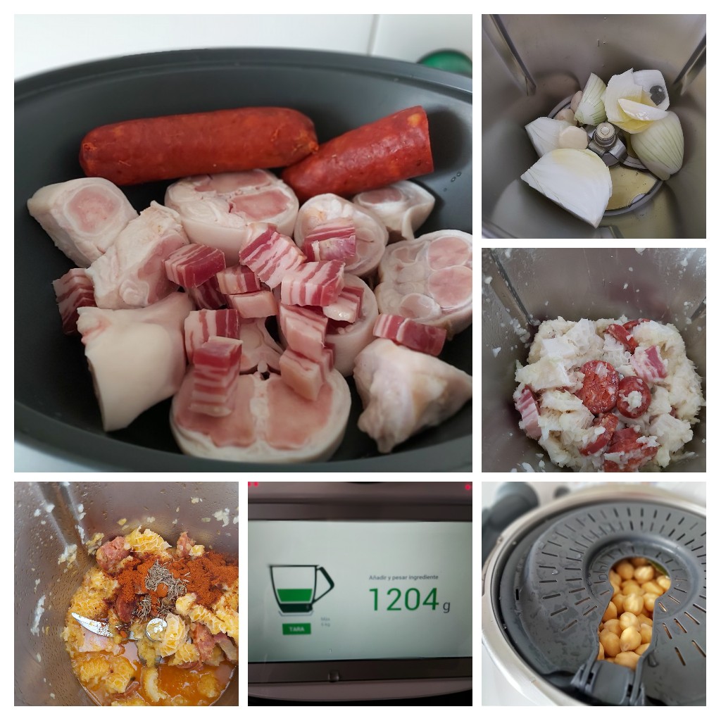 Si te gustan como a mi, más los garbanzos, en vez de 400 g puedes poner 200 g más a remojo, y los que no te entren en el cestillo, en la primera cocción, los puedes poner en la bandeja Voroma encima de la carne. Después sigues igual.