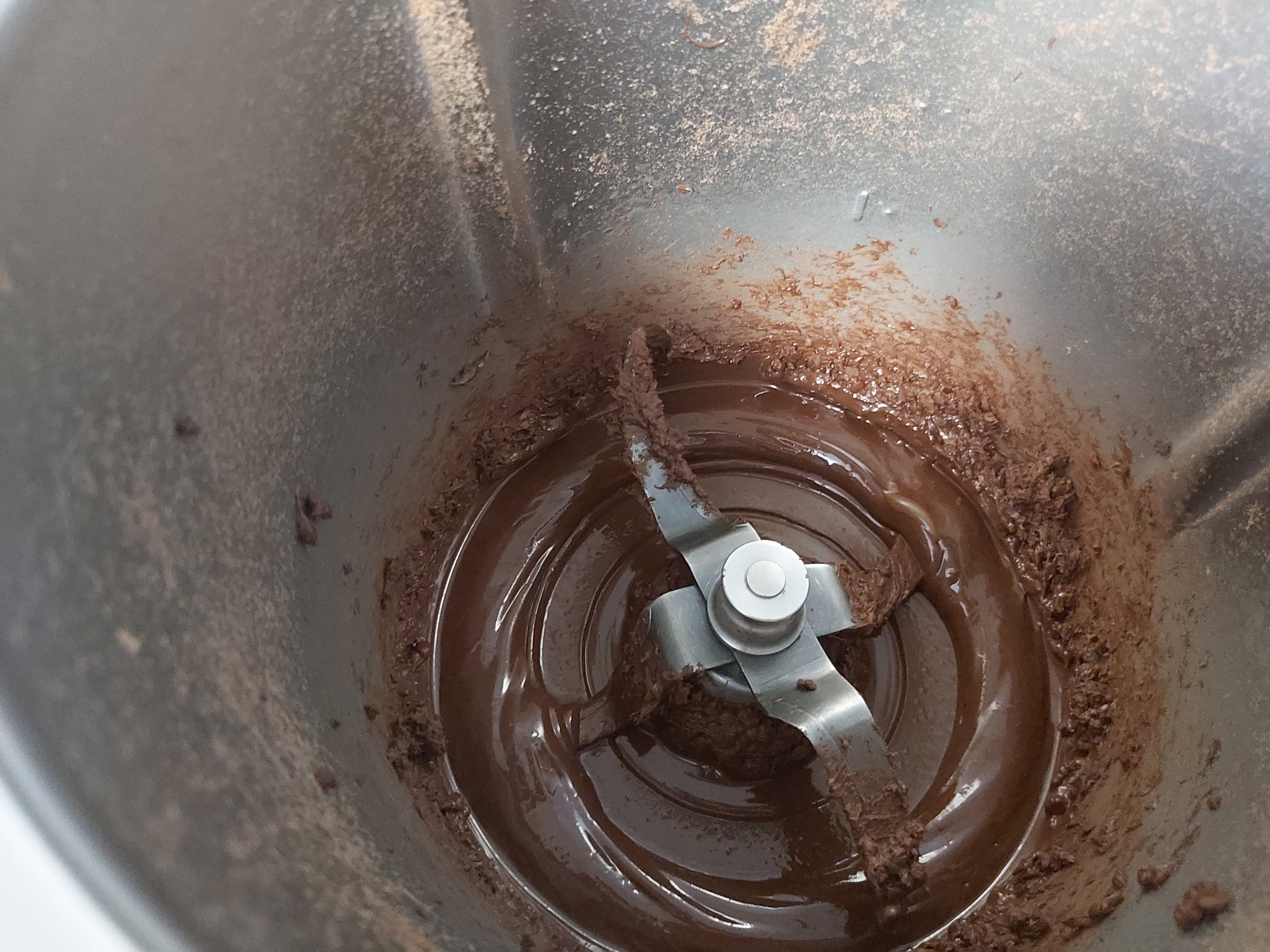 Lava el vaso y sécalo bien. Echa en el vaso el chocolate troceado y tritura 5 seg/vel 7 y funde durante 3 min/ 40ºC / vel 3. Estará listo en el momento en que se transforme en una crema. Reserva.