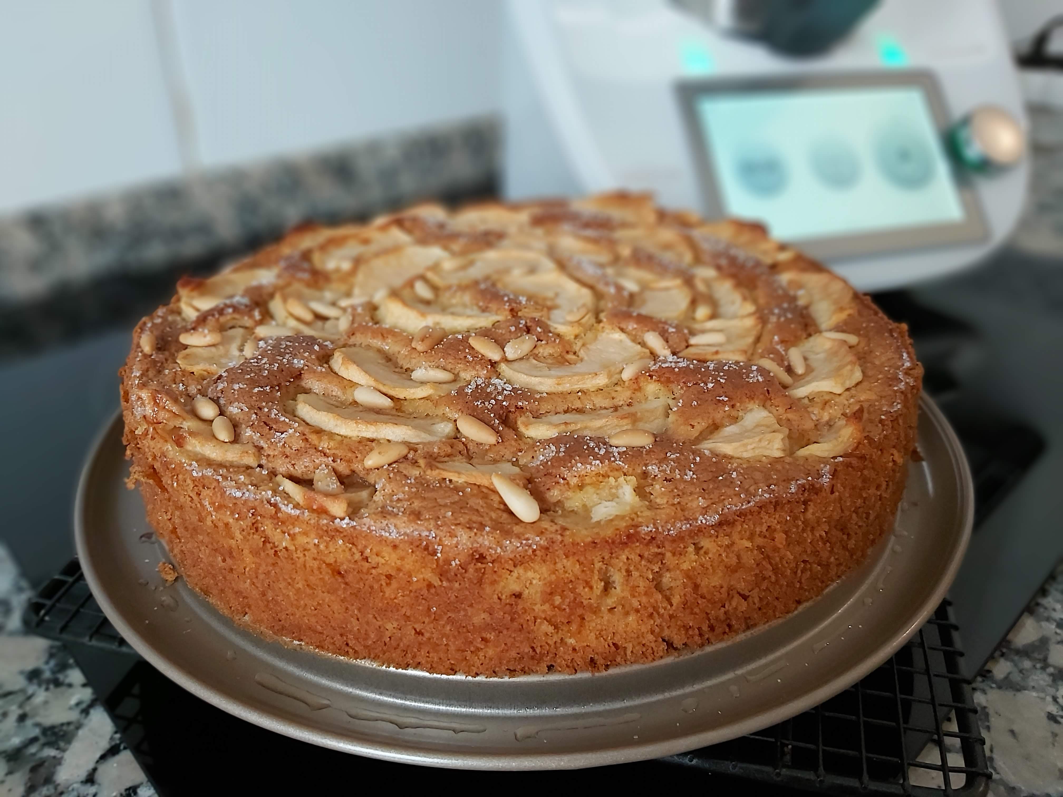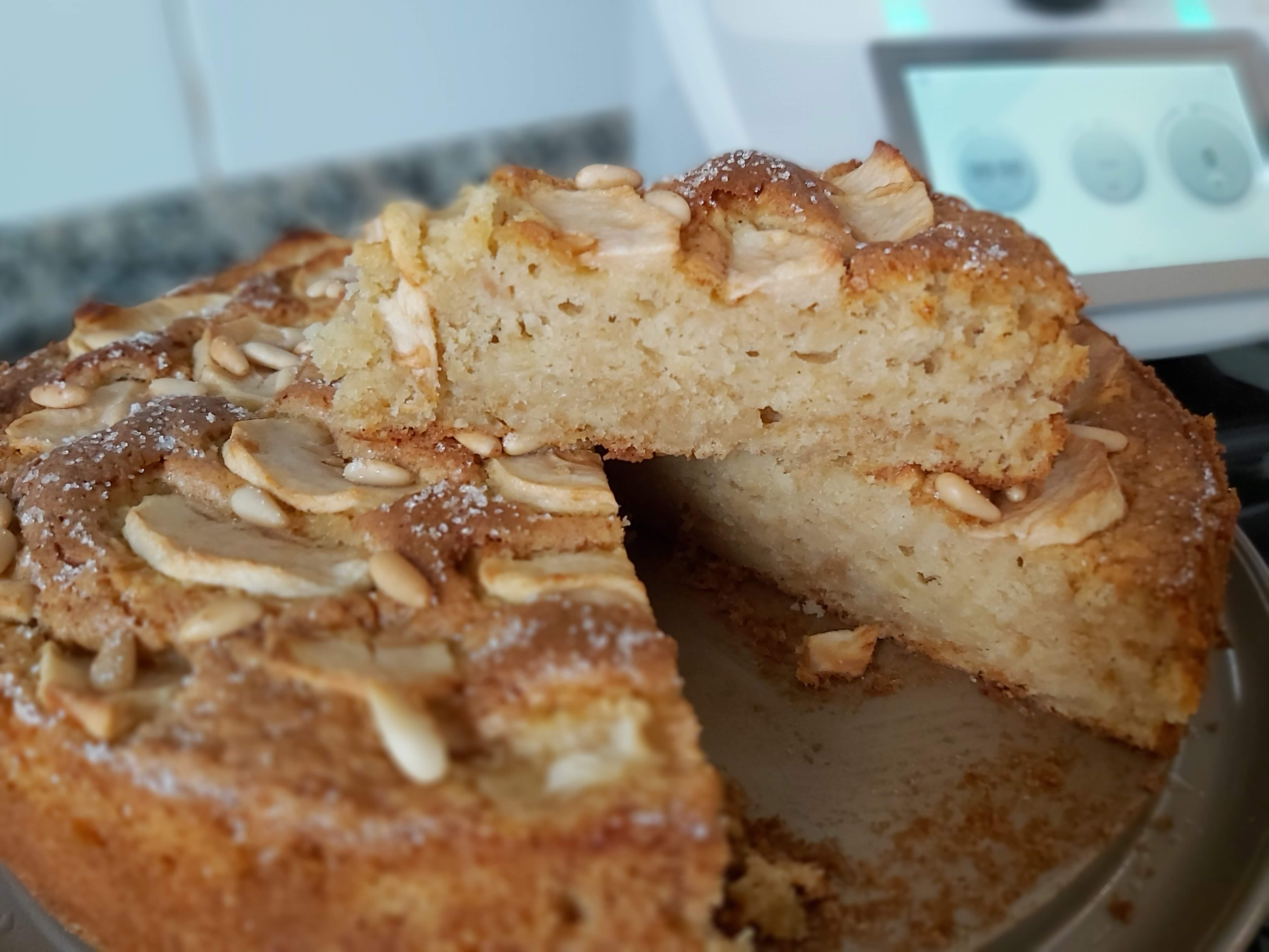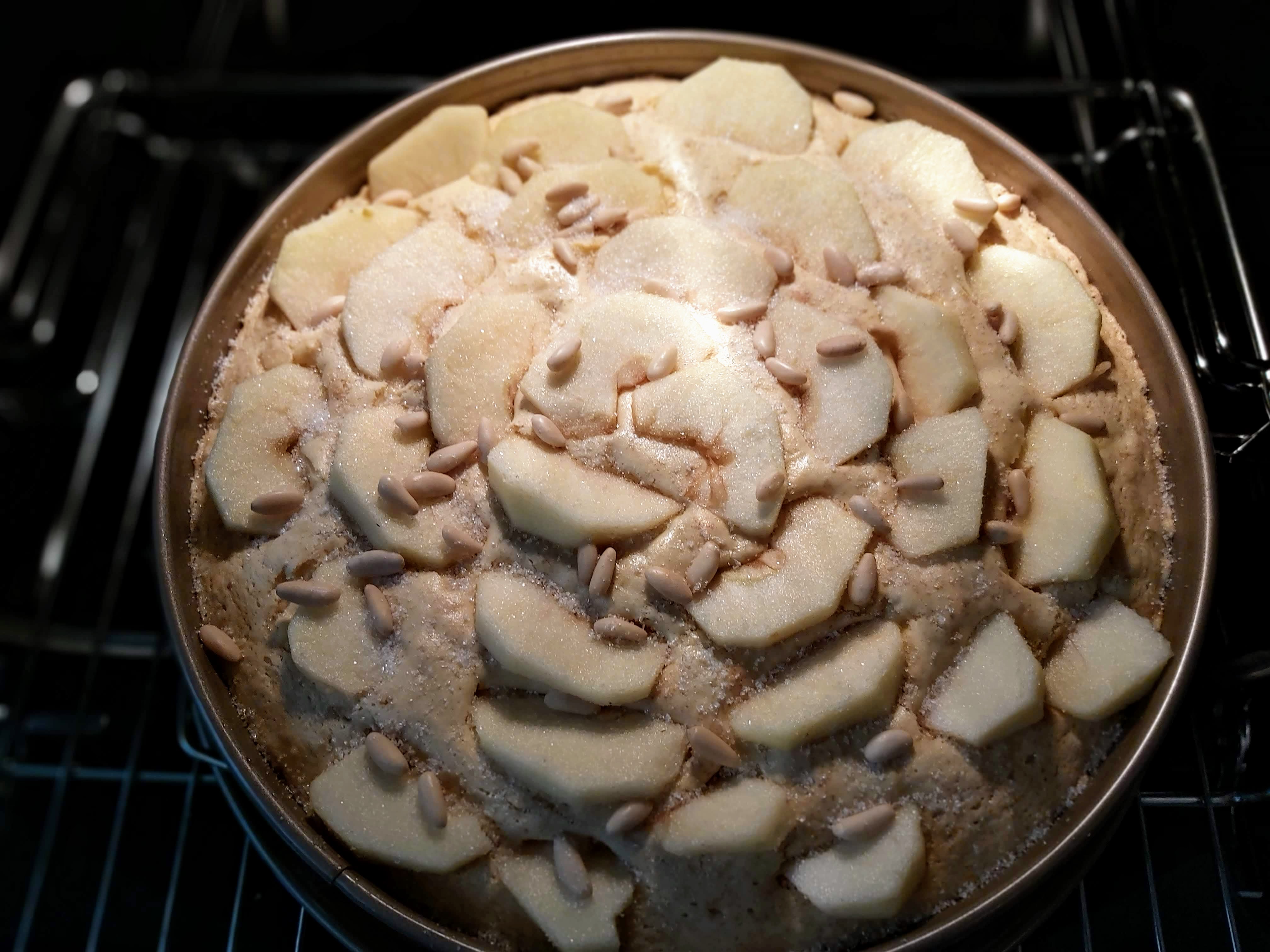 Abre la puerta del horno (no se va a bajar el bizcocho, no te preocupes) y coloca la manzana encima del bizcocho, espolvorea con azúcar y con los piñones.