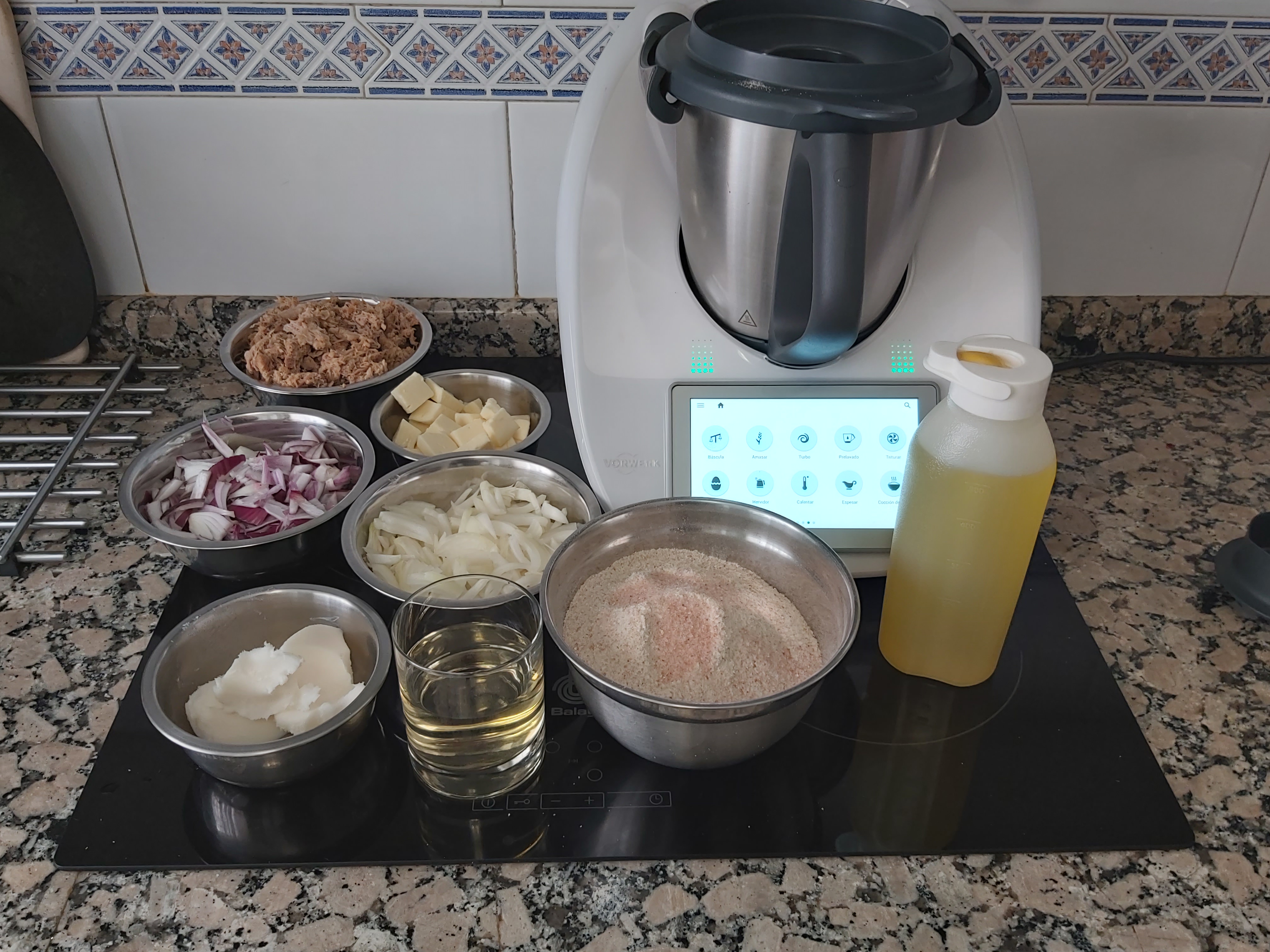 Primero vamos a hacer el sofrito , pon la cebolla y el aceite en el vaso y programa 15 min/ 120ºC/ giro inverso / vel cuchara.