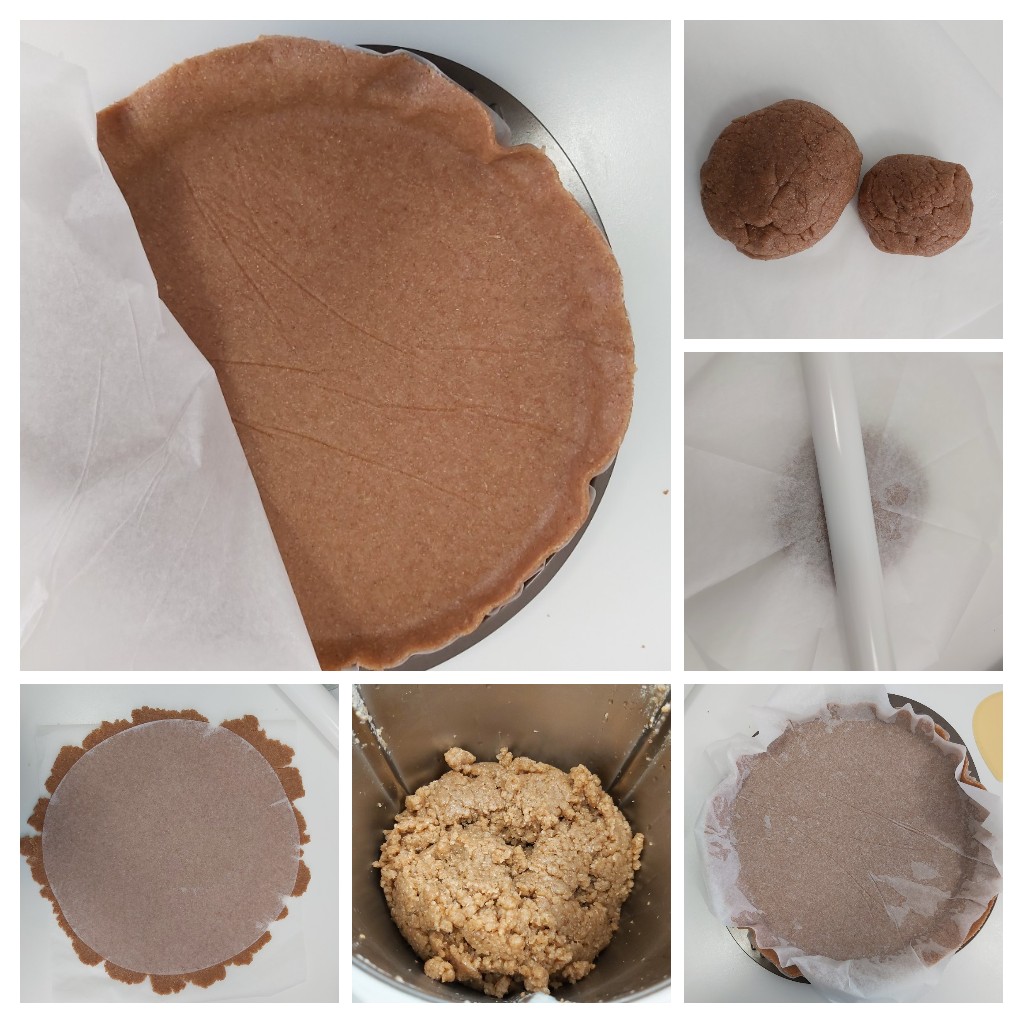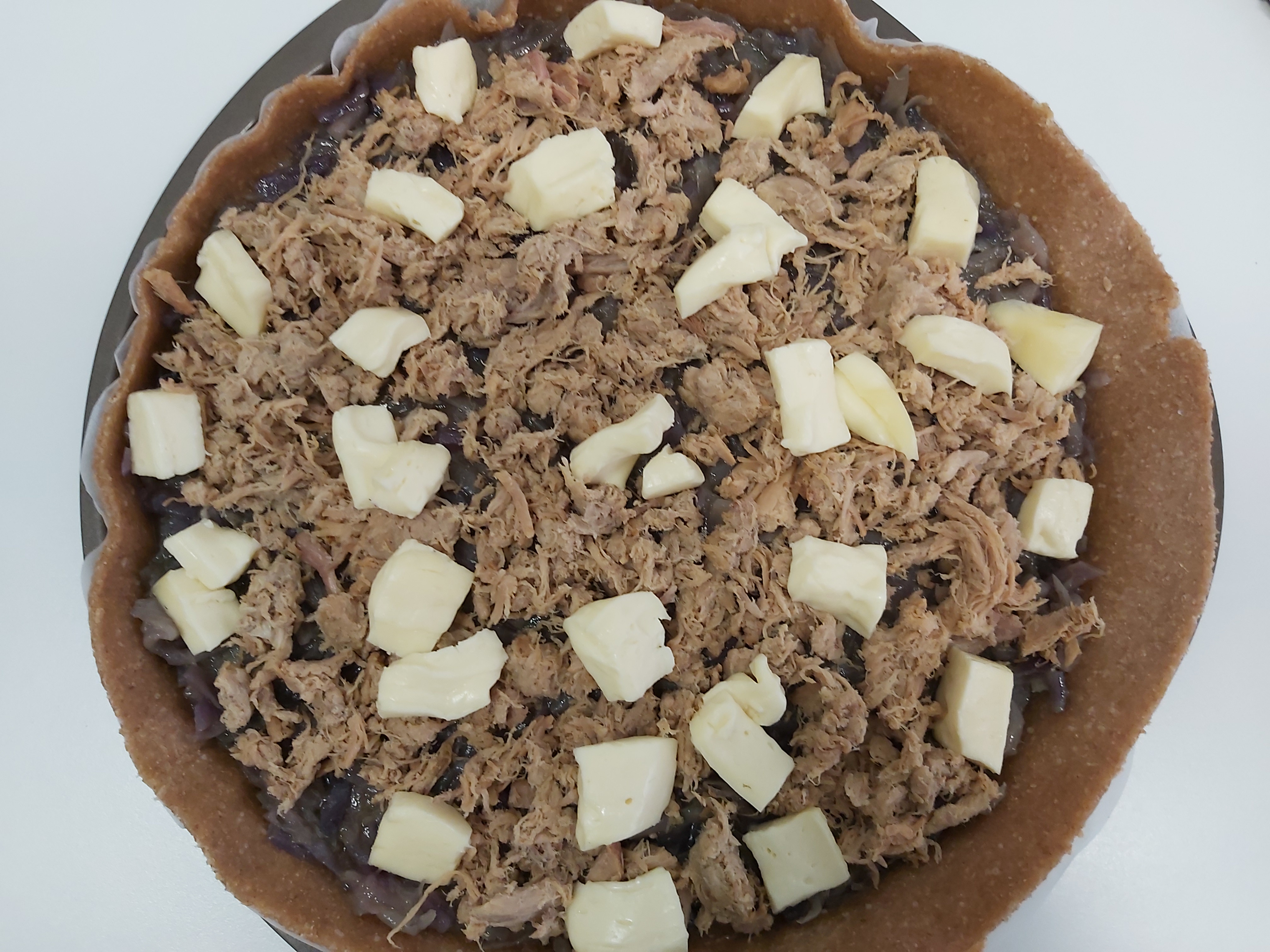 Corta dos tercios de la masa para hacer la base y estírala bien finita entre dos papeles de horno para que no se pegue o se quiebre, ya que como te dije al principio esta harina tiene muy poco gluten y tiende a resquebrajarse. Vuelca la masa en la bandeja de horno o dónde hayas elegido como molde, rellena con la cebolla reservada, los chicharrones y el queso.