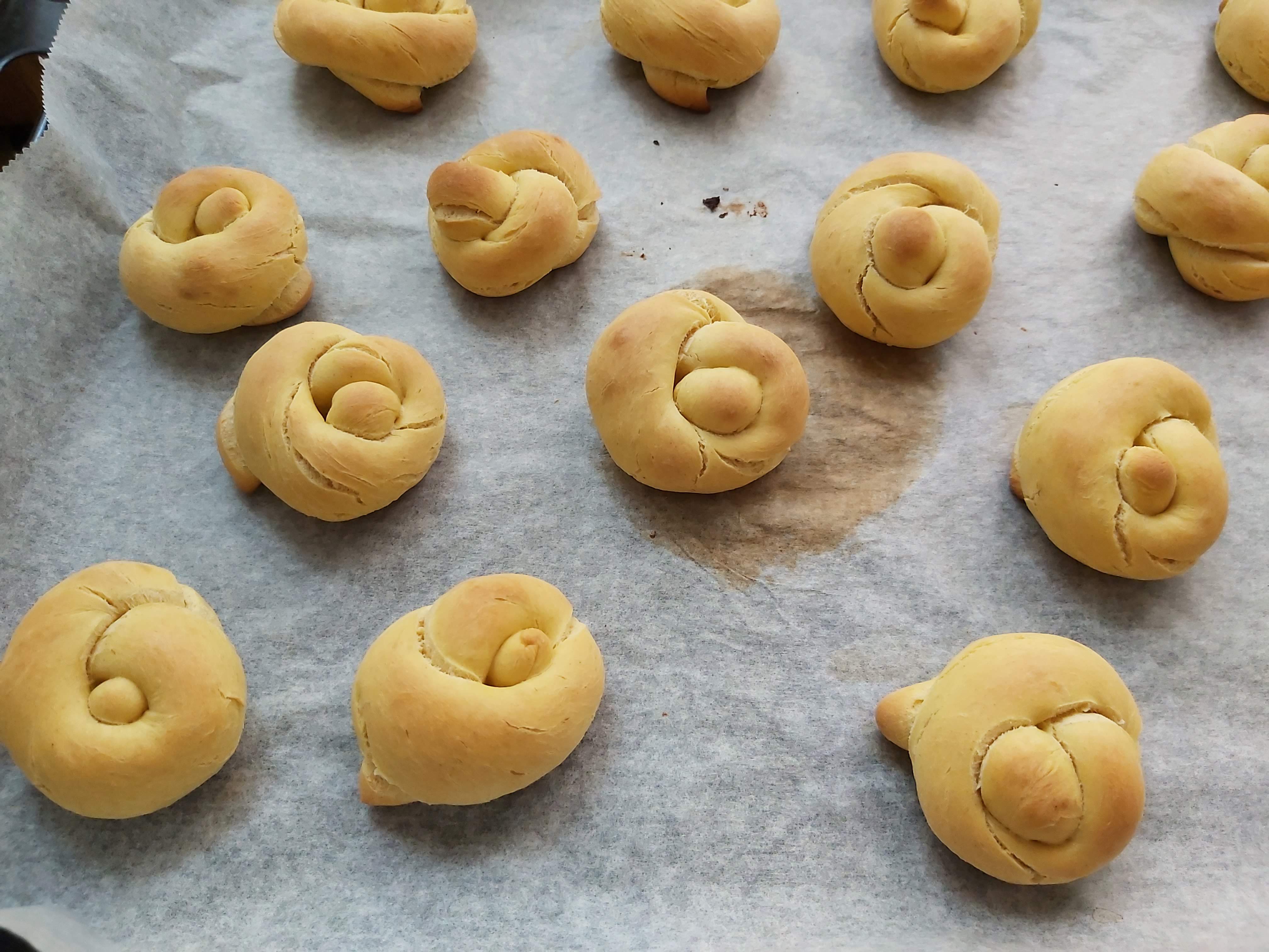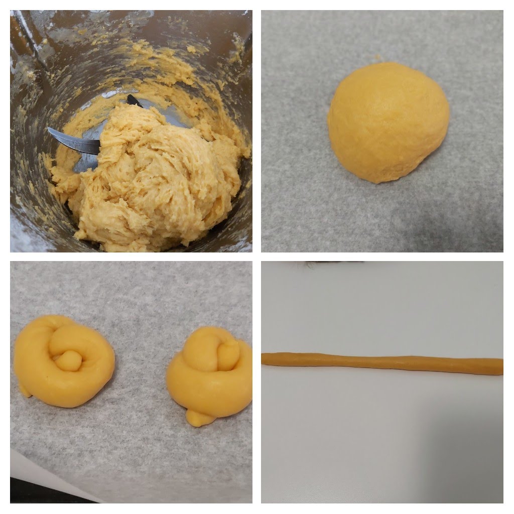 Ve cogiendo trozos de masa del tamaño de una nuez y forma rulos que enrollarás en el dedo, haciendo una rosquilla o cerrando como un pequeño nudo.