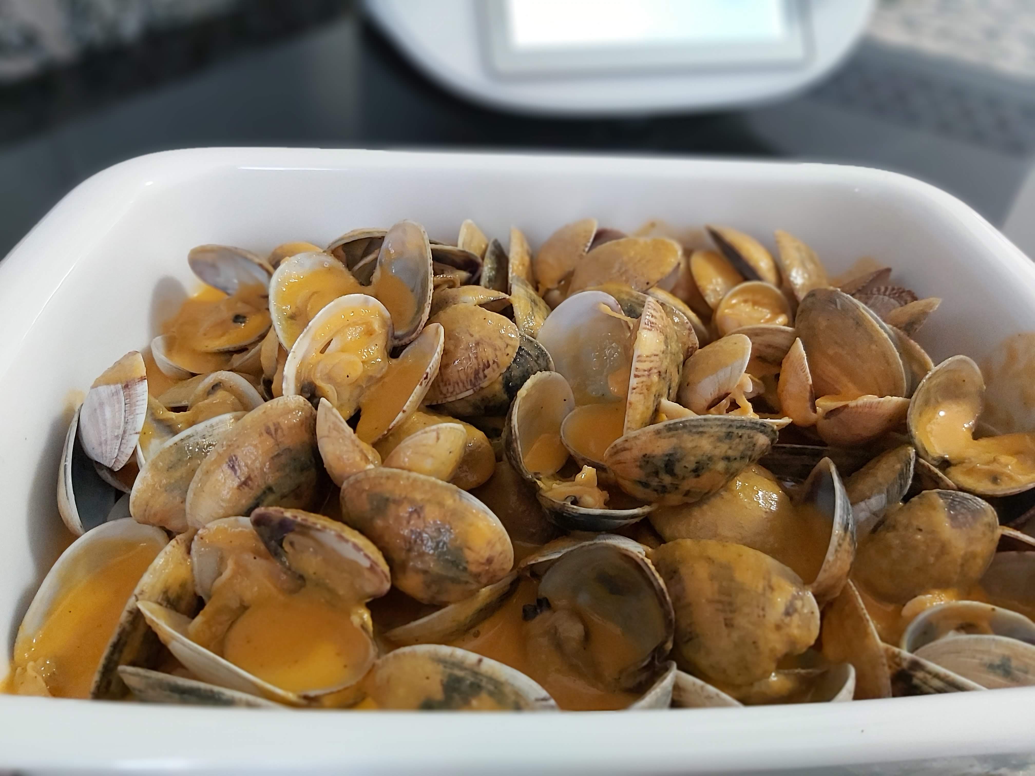 Agrega ahora el concentrado de pescado y el agua. Coloca la bandeja Varoma en su posición con las almejas lavadas y escurridas, tapa el Varoma y programa 15 min/ Varoma / vel 1.