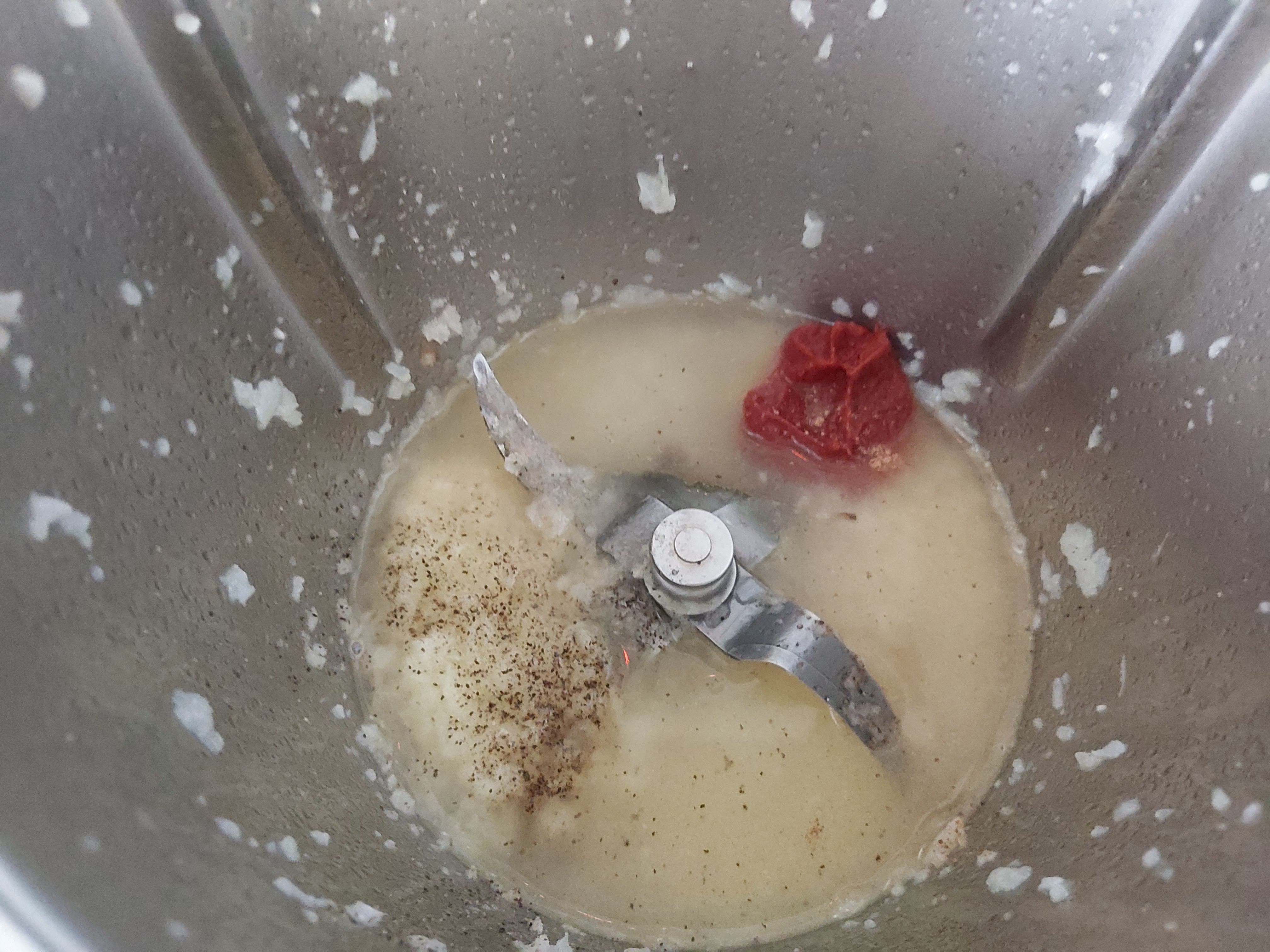 Agrega las especias, el concentrado de tomate, el zumo de limón y el vino blanco, y sin colocar el cubilete programa 2 min/ Varoma/ vel 1.