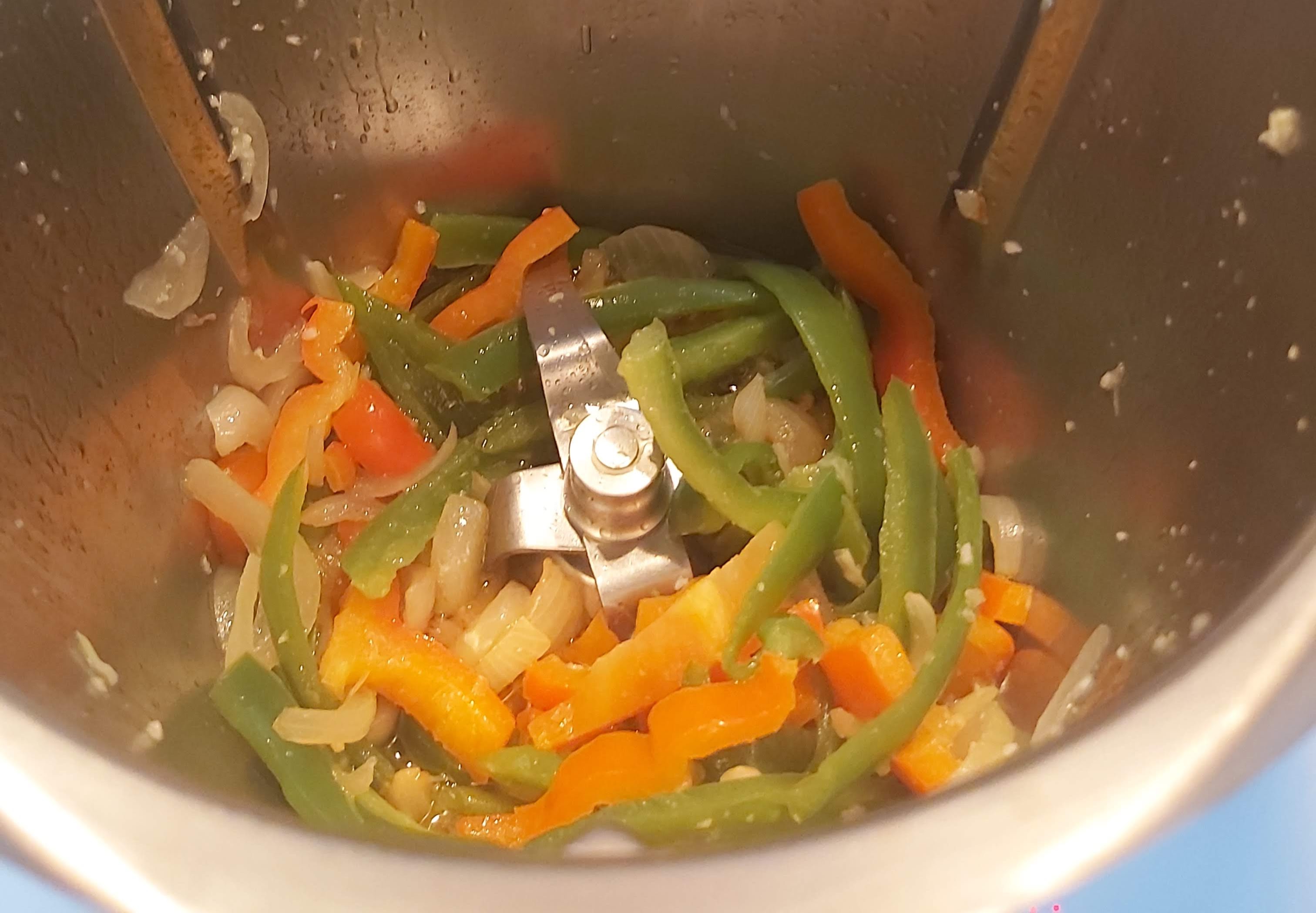 Vierte en el vaso los pimientos, la cebolla, los ajos y el aceite y sofríe 8 min/ 120ºC/ giro inverso/ vel cuchara (en TM31 temperatura Varoma) y si quieres hacerla a Alta Temperatura en TM6, sólo tienes que buscar la receta de "sofrito de pimiento rojo y cebolla y podrás hacerlo guiado)