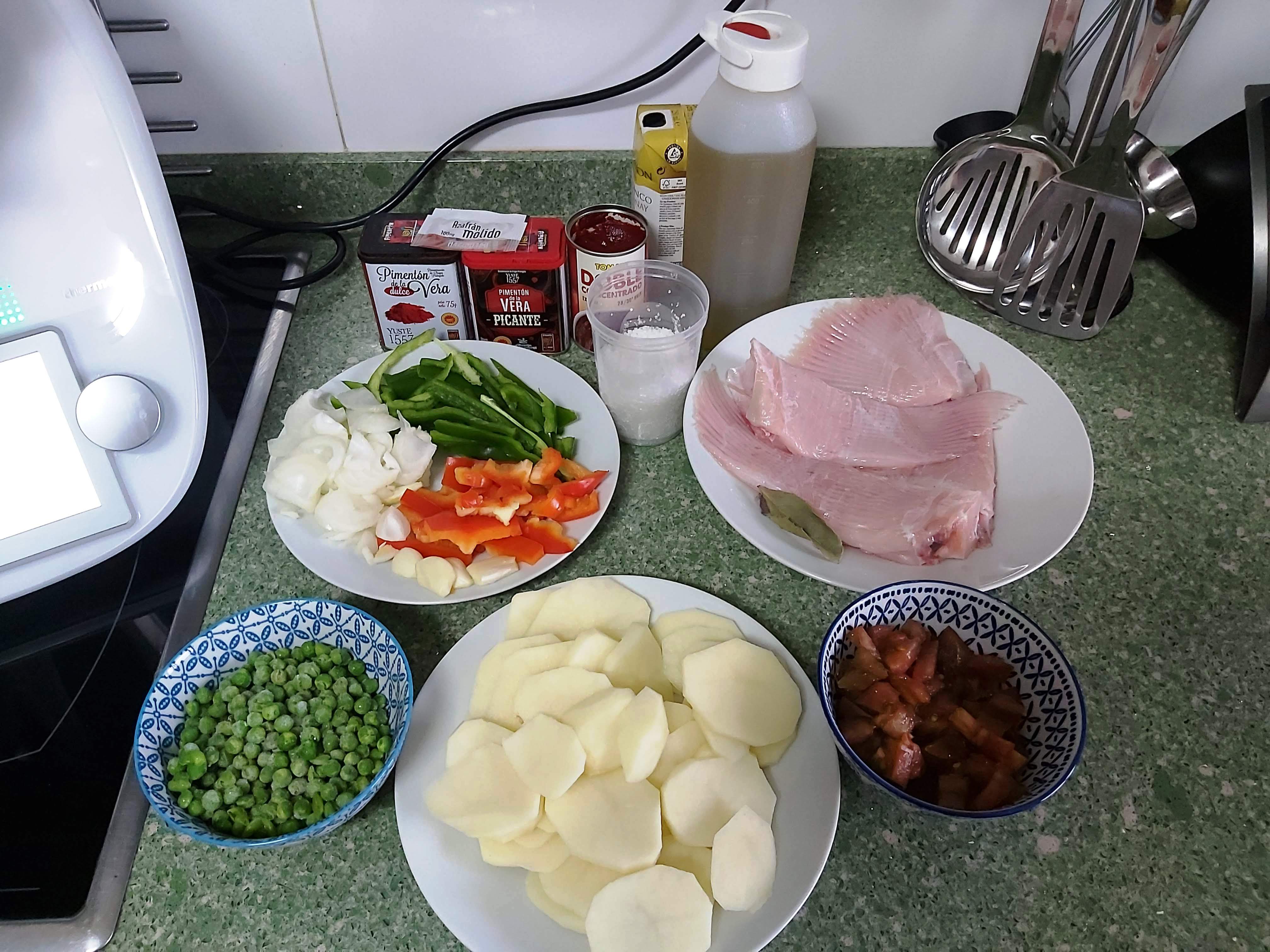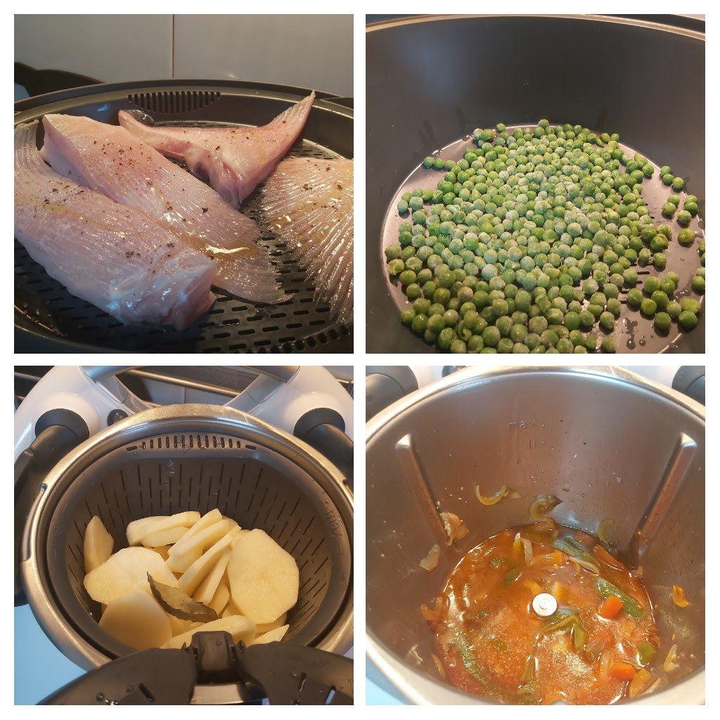 Agrega ahora el tomate troceado, el concentrado de tomate, el pimentón, el azafrán, la sal, el laurel y el vino blanco. Coloca el cestillo en el vaso con la patatas. Pon el recipiente Varoma en su posición con los guisantes . Encima coloca la bandeja Varoma engrasada en aceite con el pescado, y salpimenta al gusto. Tapa el Varoma y cuece 20 min/ Varoma/ giro inverso / vel cuchara.