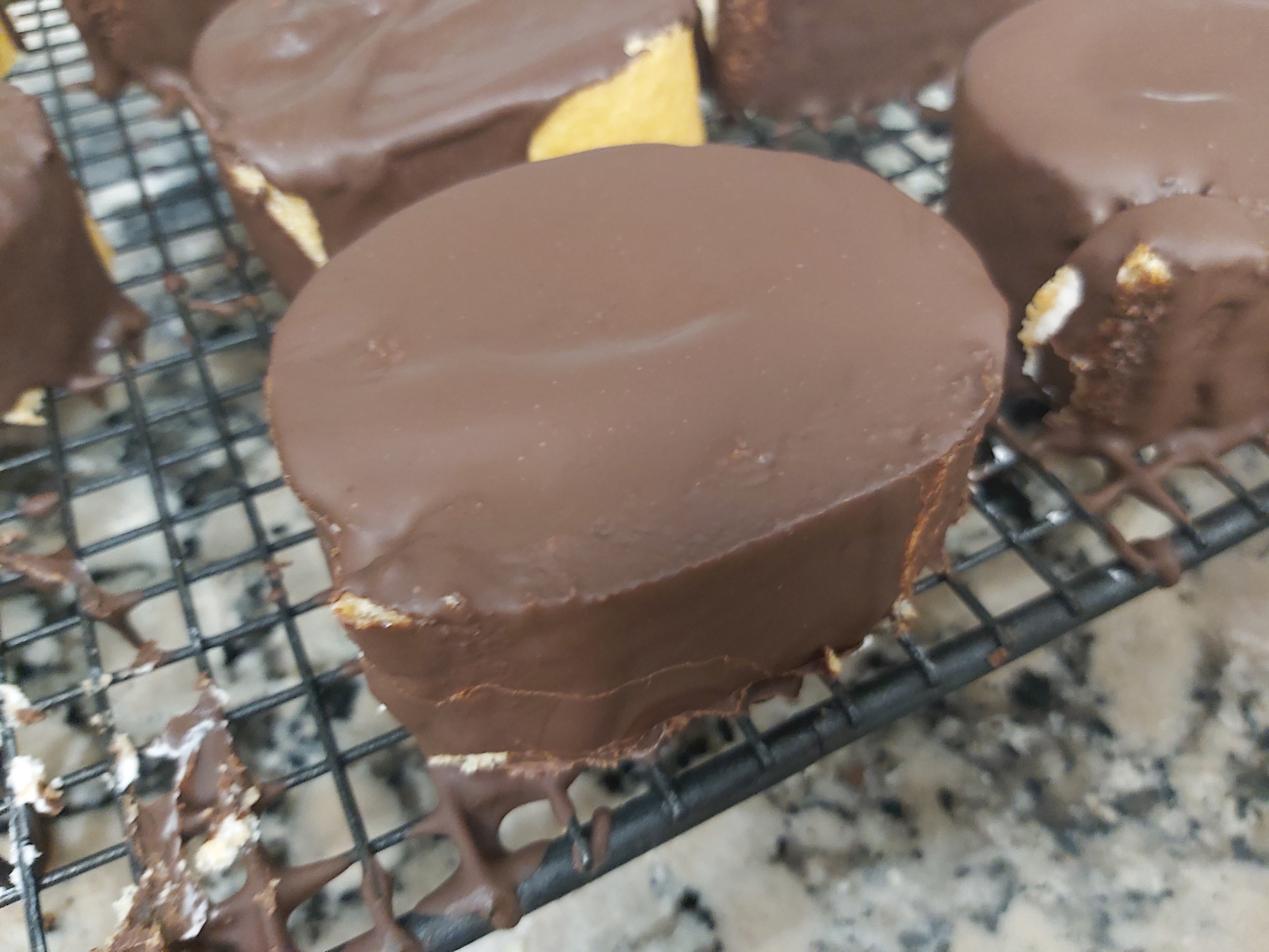Vierte el chocolate encima de los bizcochitos y deja que se endurezca ( en la nevera se endurecerán más rápido) . Recupera el chocolate que haya quedado en el papel y si hace falta caliéntalo de nuevo a 50ºC.