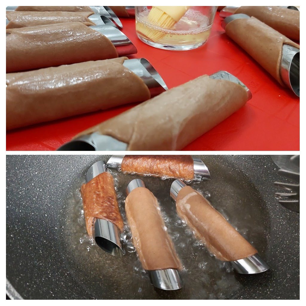 Calienta el aceite en una sartén honda a fuego medio y fríe los canutillos por tandas. Despréndelos del molde y ponlos sobre papel de cocina. Déjalos enfriar y reserva.