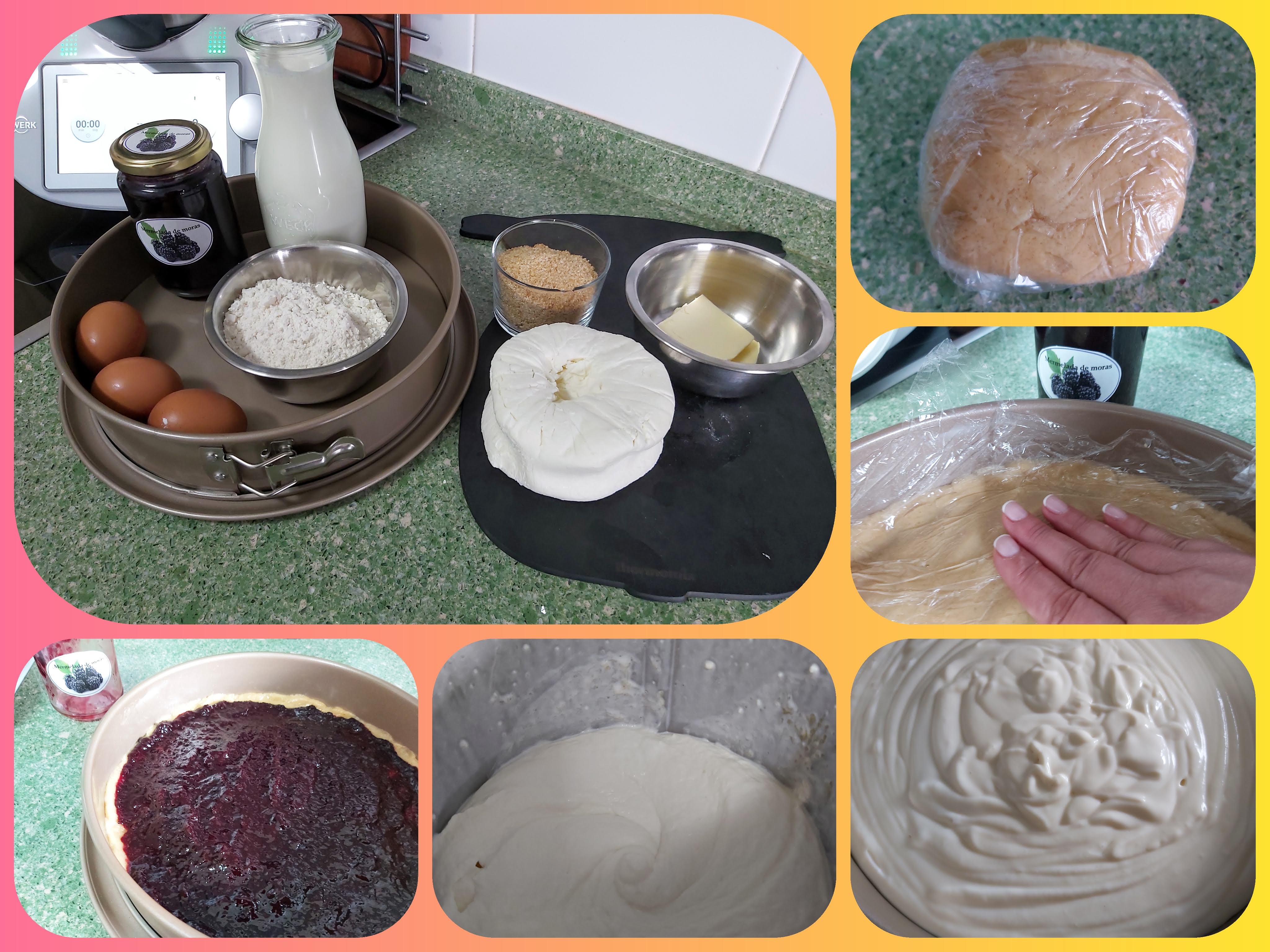 Siguiendo con las recetas con moras, esta vez una tarta de queso pero, con una base ligera de masa quebrada y con mermelada, como no, de moras, que normalmente se decora o pone por encima, pero en este caso va encima de la base.
