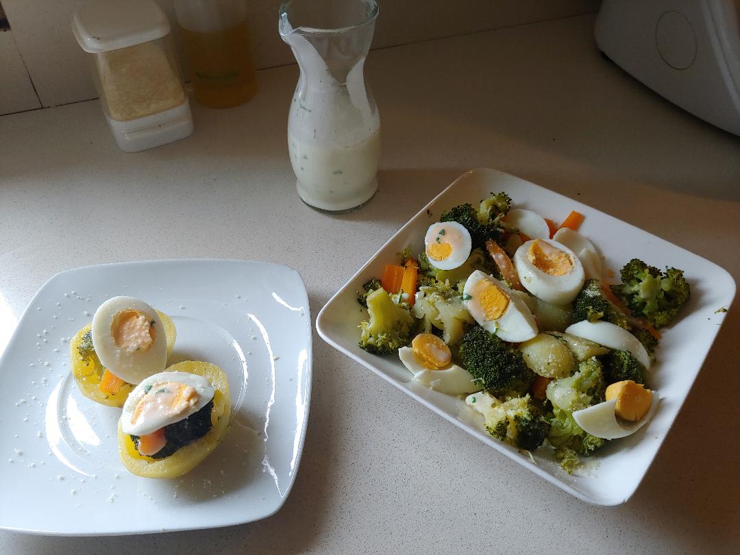 SUGERENCIA: La patata se puede rellenar con un ramito de brócoli, un baston de zanahoria y una rodaja de huevo, con un hilillo de salsa, y espolvoreada con queso rallado (al gusto)